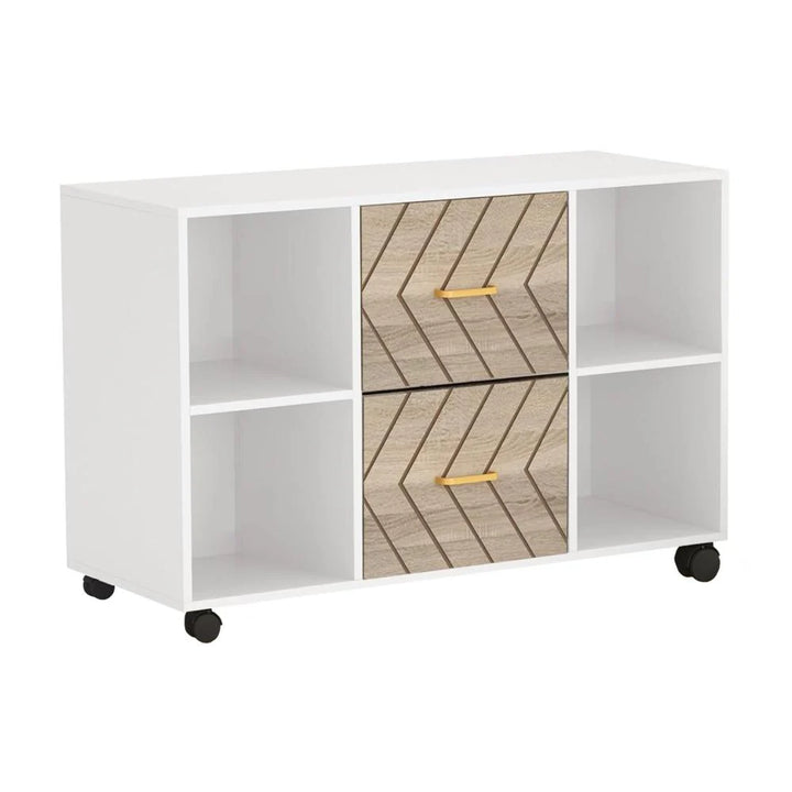 Description:This sleek white file cabinet offers a functional and stylish storage solution, featuring four storage shelves and two drawers for organizing books, files, and office essentials. The light brown drawers are perfect for securing letter-size files, while the open shelves provide convenient space for smaller office supplies.